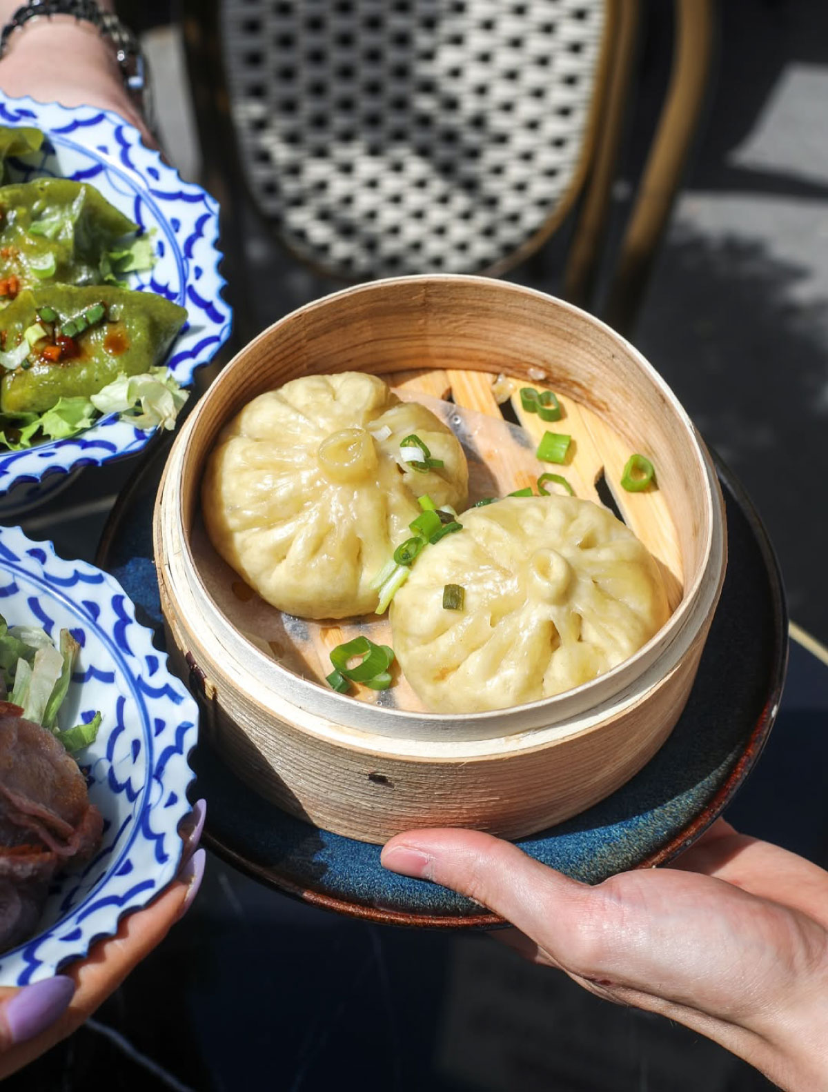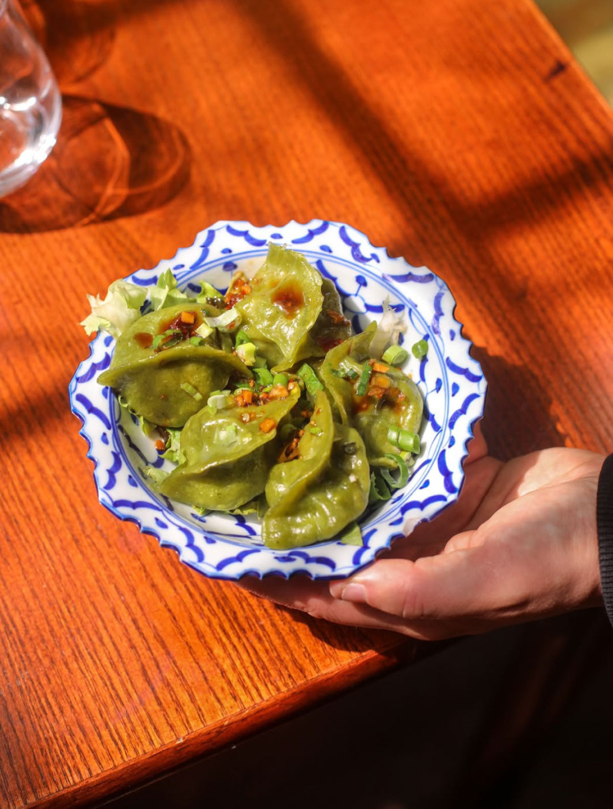 Brioches shanghaiennes au tofu, épinard, aubergine, ciboulette, pâte à l’épinard 4pcs